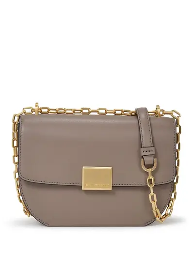 taupe grey calf leather smooth grain gold-tone hardware logo plaque logo stamp to the rear internal logo stamp foldover top with magnetic fastening leather and chain-link shoulder strap slip pocket to the front main compartment This piece comes complete with a protective dust bag.