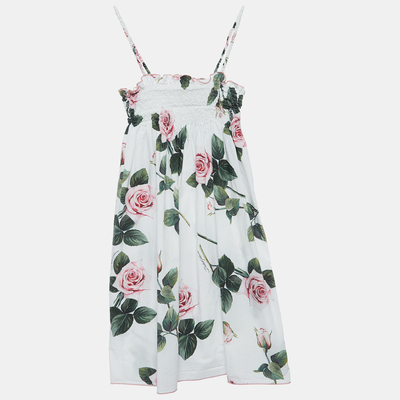 Meticulously crafted for ages 11 12, this Dolce and Gabbana white cotton dress boasts meticulous construction and comfort. The floral print adds a touch of beauty, creating a fashion forward statement piece for your young trendsetter.