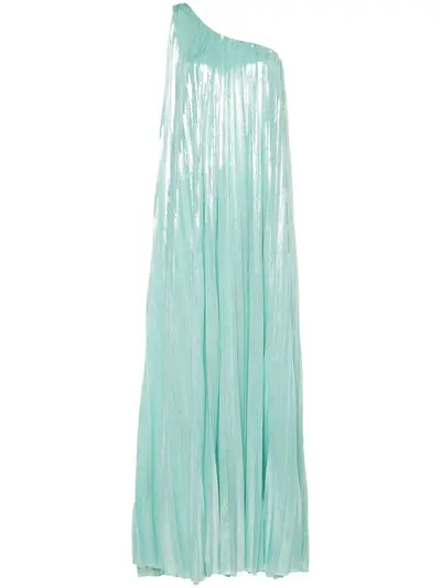 mint green stretch-design fully pleated lamé effect column silhouette asymmetric neck concealed side hook and zip fastening one-shoulder straight hem floor-length full lining