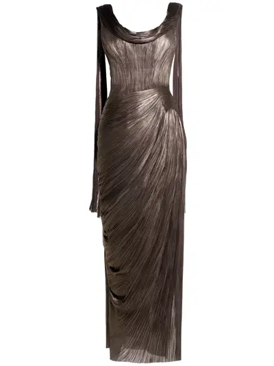 brown silk metallic finish draped detailing scoop neck wide shoulder straps rear lace-up fastening ankle-length side slit