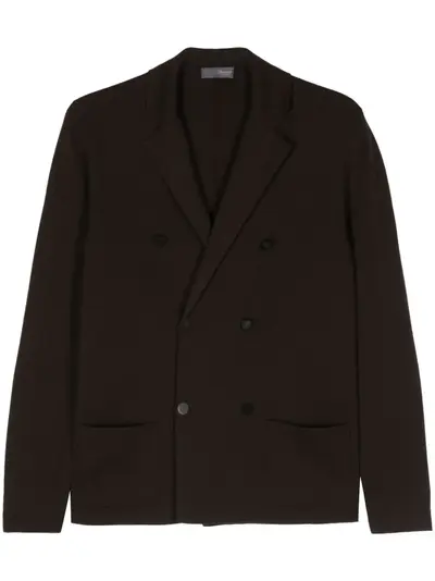 chocolate brown merino wool fine knit double-breasted button fastening peak lapels long sleeves two front patch pockets central rear vent straight hem