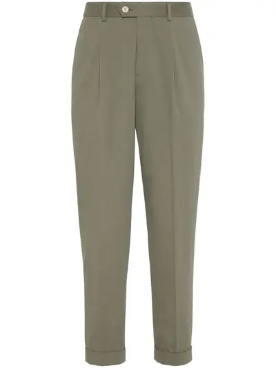 khaki Pima cotton stretch gabardine weave garment dyed pleat detailing belt loops straight leg concealed fly and button fastening two side slit pockets two rear welt pockets turn-up hem