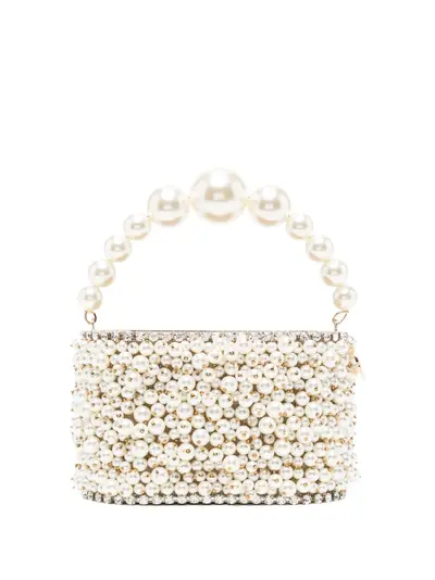 white faux-pearl embellishment crystal embellishment logo charm gold-tone hardware single top handle open top main compartment satin lining