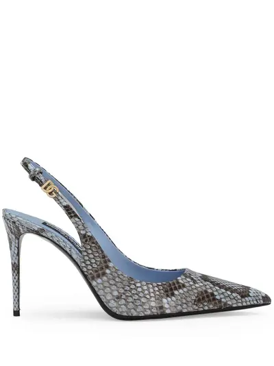 blue/grey leather snakeskin effect gold-tone logo lettering buckle-fastening slingback strap branded insole high stiletto heel
