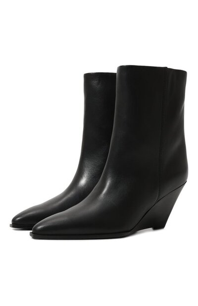 Ботильоны с зауженным мысом и скошенной танкеткой станут альтернативой казакам в городских образах. Модель с широким голенищем без застежки сшили из телячьей кожи и отделали внутри более мягкой козьей.