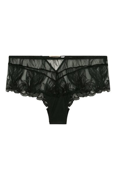 Трусы из эластичной сетки украшены французской вышивкой в виде переплетенных листьев. Сзади узорный материал оттенили гладким тюлем, а треугольный вырез подчеркнули перемычкой с золотистым декором. Белье из линии Into The Groove дополнено хлопковой ластовицей.