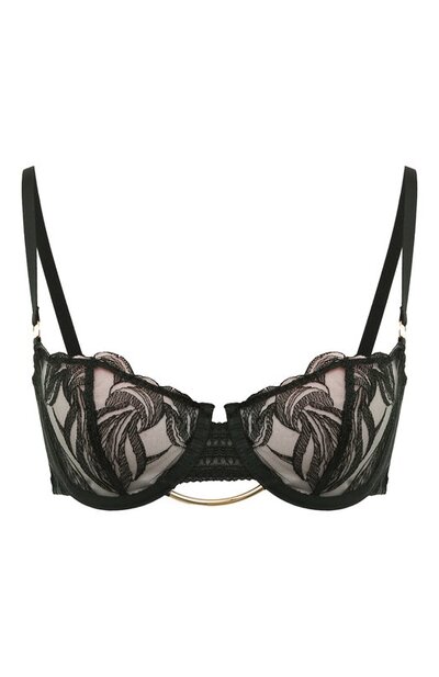 Бюстгальтер из коллекции Into The Groove выполнили из эластичной сетки с вышивкой. Спереди изделие украсили кружевной вставкой и деталью в форме золотистой дуги. В тон ей — пряжки на регулируемых бретелях.