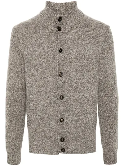 light brown virgin wool knitted construction mélange effect front button fastening ribbed high neck long sleeves two side welt pockets ribbed cuffs and hem