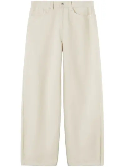 ecru cotton washed denim concealed fly and button fastening mid-rise belt loops classic five pockets rivet detailing appliqué logo straight leg long length
