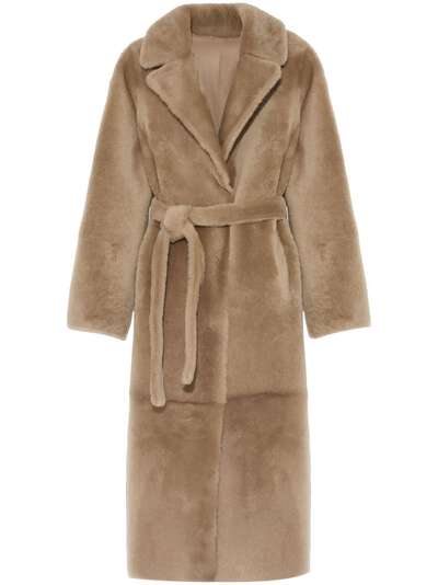 taupe brown sheepskin shearling belted waist notched lapels two side welt pockets long sleeves straight hem mid-length