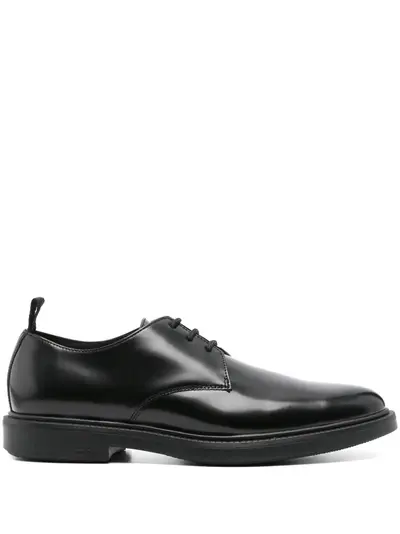 black calf leather polished finish front lace-up fastening pull-tab at the heel almond toe branded leather insole flat rubber sole