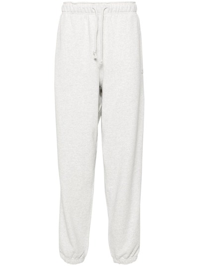 light grey cotton jersey texture mélange effect elasticated drawstring waistband ribbed panelling embroidered logo to the front two side zip-fastening pockets rear patch pocket elasticated ankles French terry lining