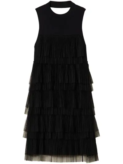black tulle inserts ruffled detailing round neck scoop back sleeveless straight hem