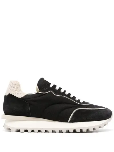 black calf suede front lace-up fastening contrasting heel counter flannel panelling logo patch at the tongue round toe branded insole EVA midsole rubber sole