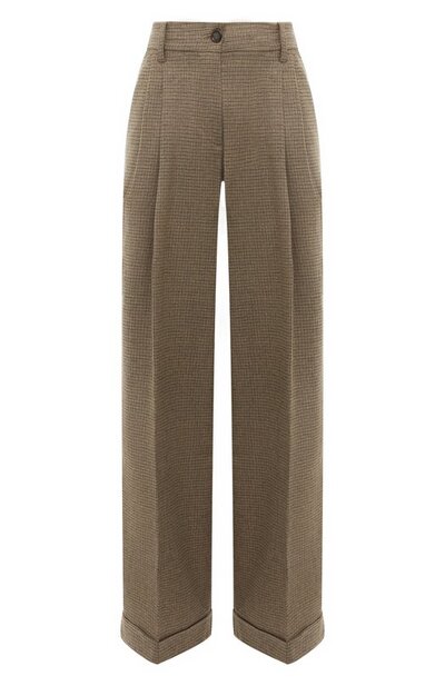 Для пошива широких клетчатых брюк с отворотами и складками под поясом со шлевками для ремня использовали фактурную шерсть с добавлением вискозы. Модель со стрелками и четырьмя карманами предлагаем носить с пуловером и лоферами.
