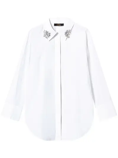 white cotton blend poplin texture front button fastening spread collar crystal embellishment long sleeves buttoned cuffs curved hem