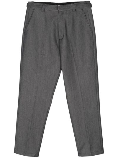 black/white virgin wool-cotton blend twill weave diagonal stripe pattern concealed front button, hook and zip fastening mid-rise belt loops detachable adjustable waist strap pressed crease two diagonal pockets to the sides two rear welt pockets straight leg