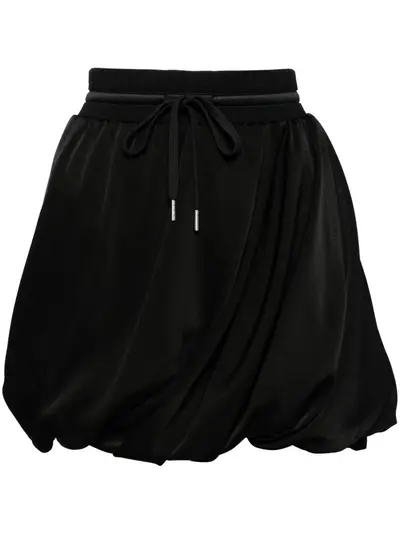 black satin finish crepe texture drawstring fastening waist ribbed waistband two side slash pockets puffball hem contrast lining high-waisted