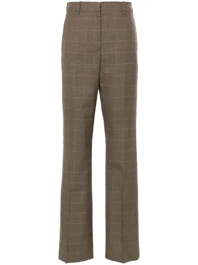 beige/black/red virgin wool cotton concealed front button, hook and zip fastening dogtooth pattern mid-rise belt loops pressed crease two side inset pockets signature star plaque to the rear tailored cut straight leg