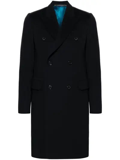 black wool-cashmere blend double-breasted button fastening peak lapels long sleeves two front flap pockets full lining American rear vent straight hem