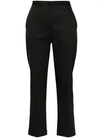 black cotton blend gabardine weave stretch-design front button and zip fastening pressed crease two diagonal pockets to the sides rear elasticated waistband tapered leg