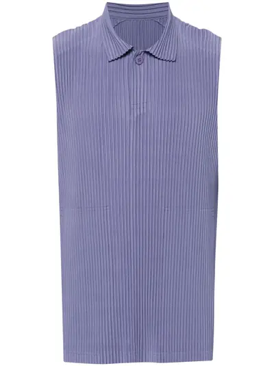 lilac purple front button placket fully pleated plissé effect polo collar sleeveless two side slit pockets straight hem
