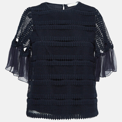Chloe Navy Blue Crochet Flutter Sleeve Top S 1020727 (lpn26852185)