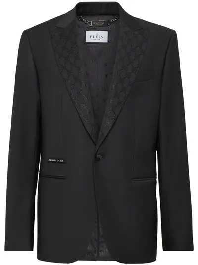 black monogram pattern front button fastening peak lapels rhinestone embellishment long sleeves jetted chest pocket appliqué logo two front welt pockets buttoned cuffs full lining straight hem