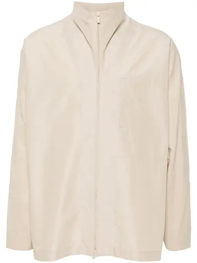 light beige cotton blend front two-way zip fastening mock neck long sleeves with buttoned cuffs chest welt pocket straight hem
