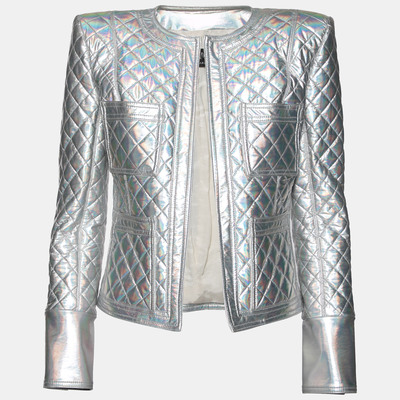 The silver holographic quilted pattern of this Balmain jacket shows the brands knack for extraordinary designs. Created from a mix of quality fabrics, it is characterized by an open front, long sleeves with a buttoned cuff, and four external pockets.
