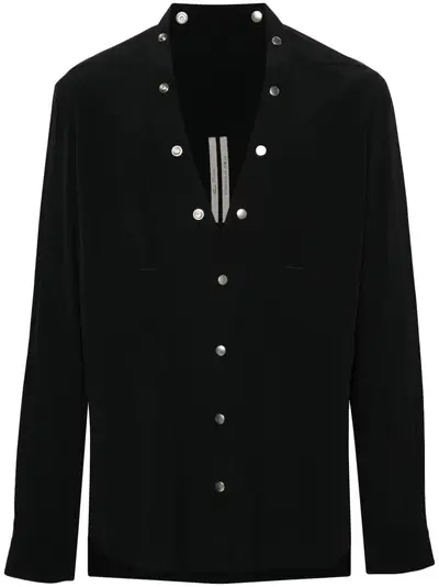 black crepe texture V-neck long sleeves buttoned cuffs two chest inset pocket curved hem front press-stud fastening