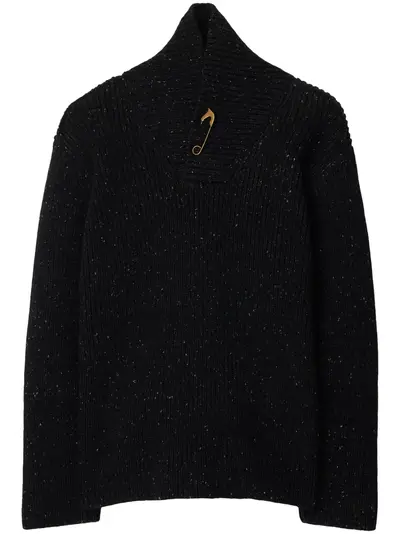 black wool speckle ribbed knit safety pin detail shawl collar drop shoulder long sleeves straight hem