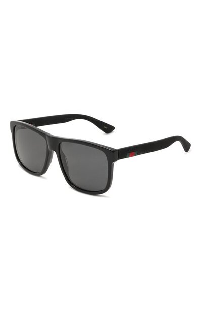Квадратные солнцезащитные очки с дымчатыми полупрозрачными линзами выполнили из гладкого ацетата. Дужки модели украсили фактурным логотипом, который поддержали вставкой, напоминающей ленту Web.