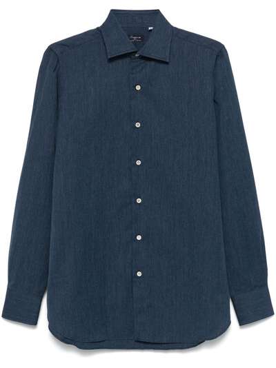 navy blue cotton-cashmere blend interlock weave vertical stripe pattern front button fastening spread collar long sleeves buttoned cuffs mini logo tag curved hem