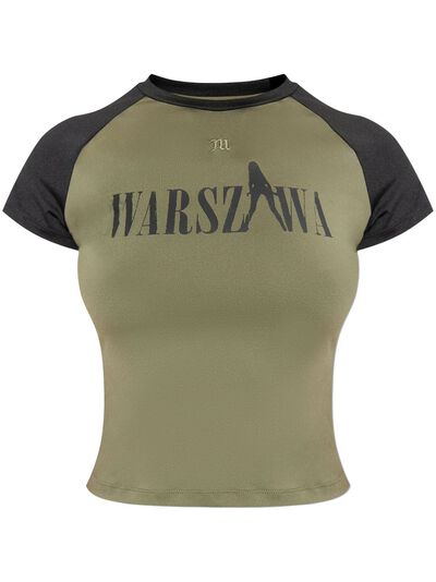 khaki green/black embroidered logo to the front graphic print to the front round neck short raglan sleeves straight hem cropped two-tone design