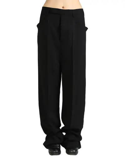 black concealed front fastening belt loops two side slash pockets pressed crease two rear welt pockets wide leg