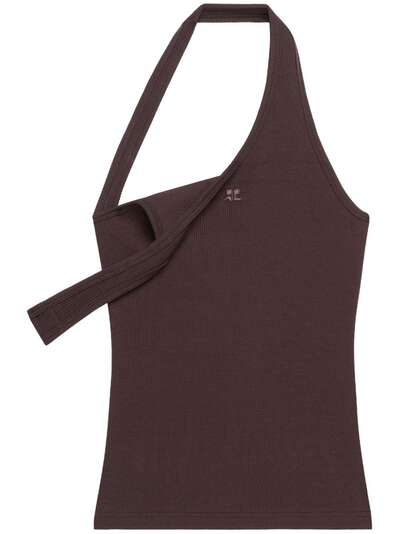 brown stretch-cotton ribbed knit jersey texture embroidered logo to the front asymmetric design halterneck sleeveless straight hem