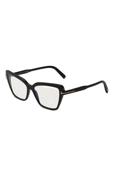 Оправу формы cat eye дополнили линзами с покрытием blue-block, защищающим от воздействия голубого света гаджетов. Аксессуар из глянцевого ацетата декорировали золотистыми Т-образными вставками на узких дужках.