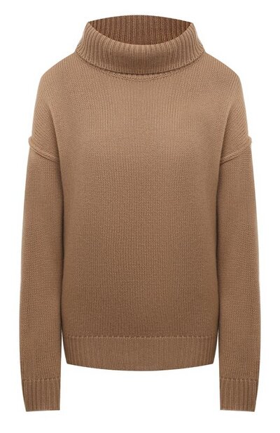 Свободный светло-бежевый свитер выполнили из комбинации шерсти и кашемира. Швы на спущенной линии плеч выполнили наружу. Изделие с широким воротником идеально дополнит базовый гардероб.
