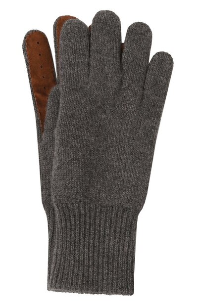 Меланжевые перчатки с рельефной манжетой связали из кашемировой пряжки. Ладонную сторону аксессуара без подклада укрепили замшевой накладкой, дополненной перфорированным узором.