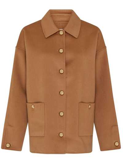 camel brown wool-cashmere blend felted front button fastening classic collar long sleeves buttoned cuffs two front patch pockets side slits straight hem rear curved hem