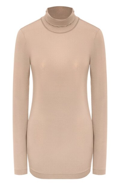 Приталенную водолазку выполнили из эластичного хлопкового трикотажа с добавлением ламинированных нитей. Высокую горловину однотонной модели подчеркнули строчкой из цепочки мониль, знаковой для марки.