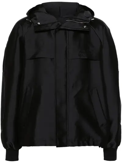 black embroidered logo at the chest front press-stud and zip fastening drawstring hood high neck long raglan sleeves ribbed cuffs two side welt pockets unlined drawstring hem