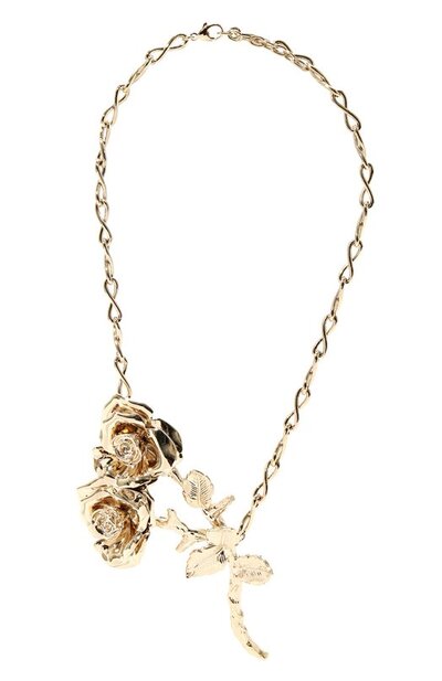 Колье-цепочку с крупными звеньями в форме символа бесконечности дополнили вставкой в виде ветви розы. Регулируемое украшение из латуни с гальваническим покрытием золотом застегивается небольшим карабином.