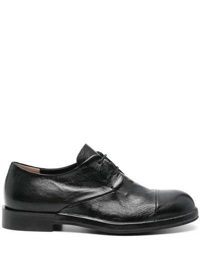 black calf leather grained texture front lace-up fastening round toe branded leather insole low stacked heel rubber sole
