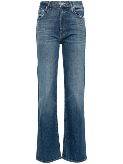 medium blue stretch-cotton washed denim high-rise concealed fly and button fastening belt loops classic five pockets mini logo tag straight leg