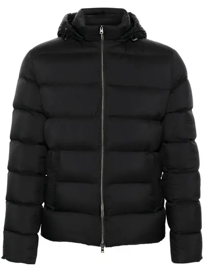 black goose down padded design front two-way zip fastening detachable drawstring hood long sleeves two press-stud fastening side pockets silver-tone logo plaque multiple internal slip pockets full lining straight hem