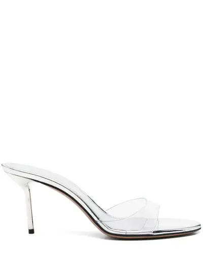 silver-tone calf leather metallic finish foiled finish slip-on style mid heel single toe strap almond open toe branded footbed leather sole
