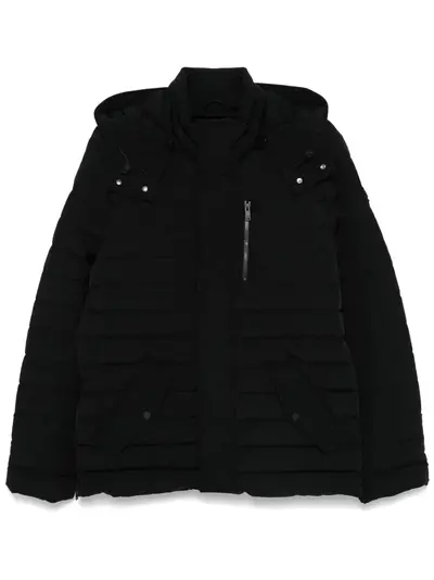 black down-feather filling shell padded design quilted water-repellent waterproof windproof insulated design front press-stud and zip fastening detachable drawstring hood stand-up collar long sleeves signature Hollow Frame Antique plaque at the sleeve zip-fastening chest pocket two front flap pockets two side zip-fastening slits two internal zip-fastening pockets partial lining straight hem
