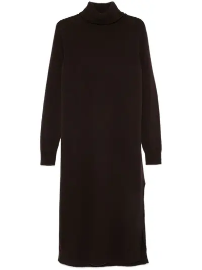 coffee brown merino wool-cashmere blend fine knit ribbed trim roll neck long sleeves side slits unlined straight hem mid-length